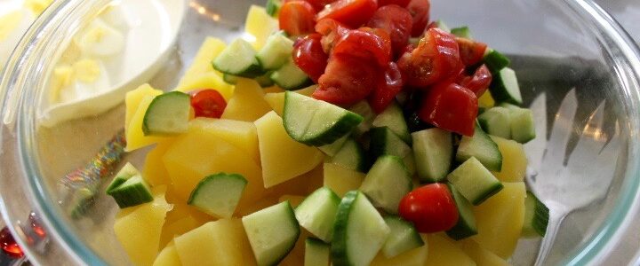 Peel and chop the red onions, diced green onion, cube the english cucumber and baby tomatoes cut in half. Toss into the same bowl with your potatoes.