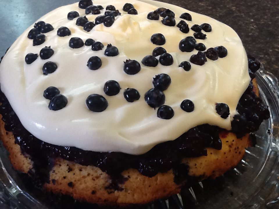 - On a cake plater, place your cake, then top with your blueberry sauce, top with your whipped cream spreading it over the blueberries filling.